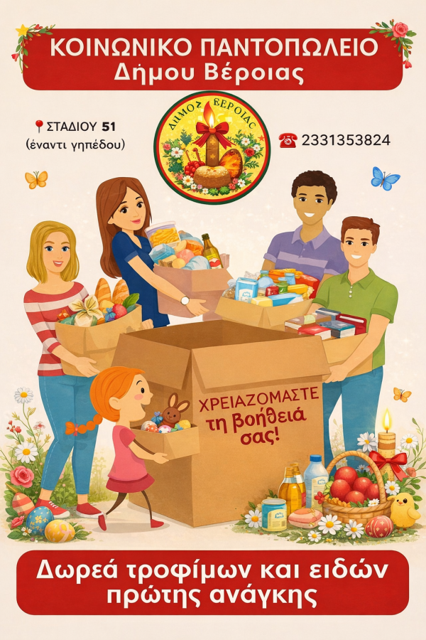 Το Κοινωνικό Παντοπωλείο του Δήμου Βέροιας, παραμένοντας το σταθερό στήριγμα για εκατοντάδες οικογένειες της πόλης μας που δοκιμάζονται, απευθύνει κάλεσμα αλληλεγγύης προς τους πολίτες, τις επιχειρήσεις και τους φορείς της περιοχής μας.